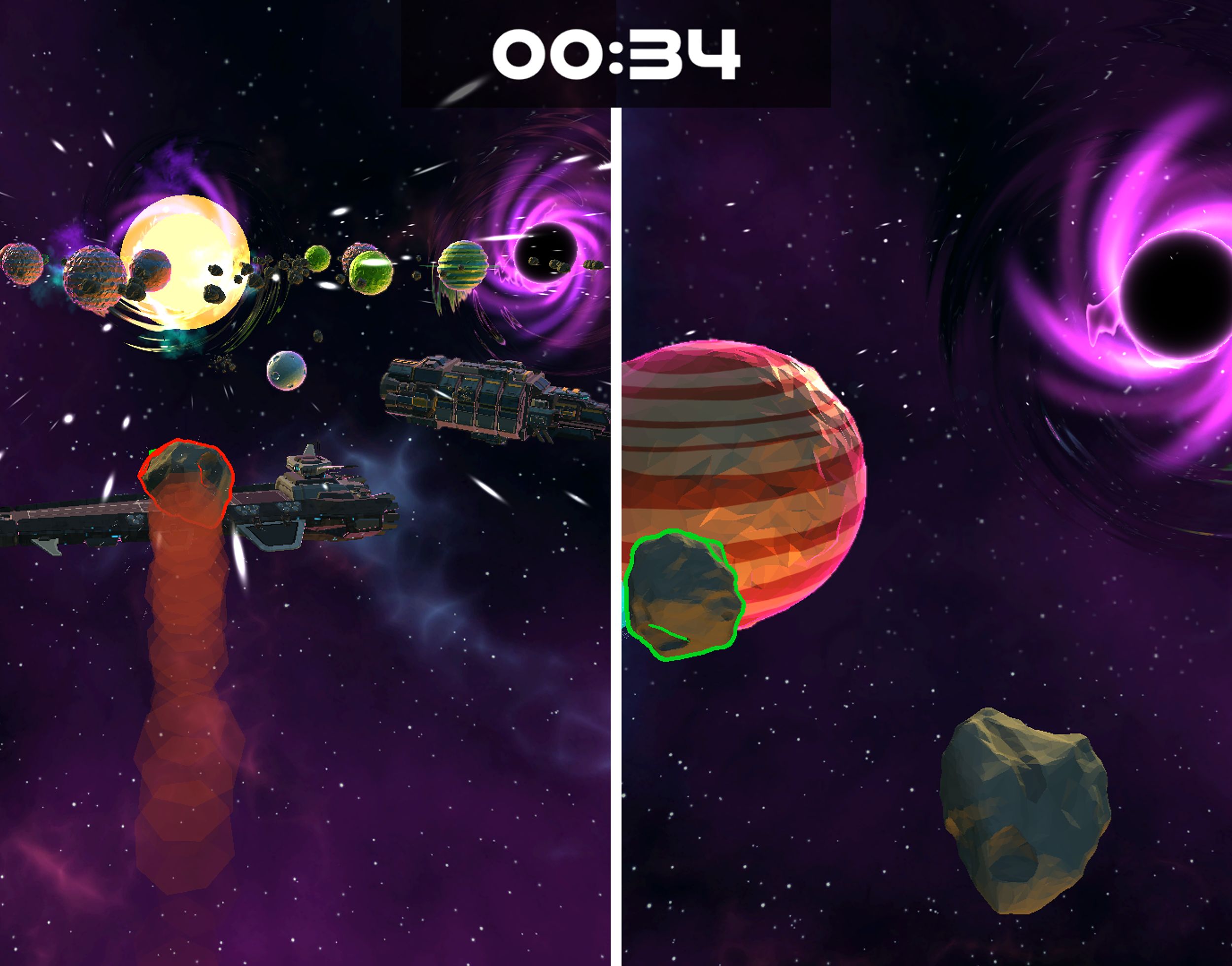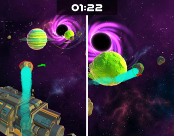 Orbit Rush is a chaotic 2-4 player couch multiplayer game in which each player controls an asteroid and navigates through a solar system at increased speed. The aim of the game is to collide with opposing players with as much speed and mass as possible in order to destroy them. Speed can only be built up by orbiting planets and mass can be gained by eating up smaller asteroids flying around. The player who has more mass and speed in a collision destroys the opponent and receives a point. Whoever has collected the most points after 5 minutes is crowned champion of the universe.